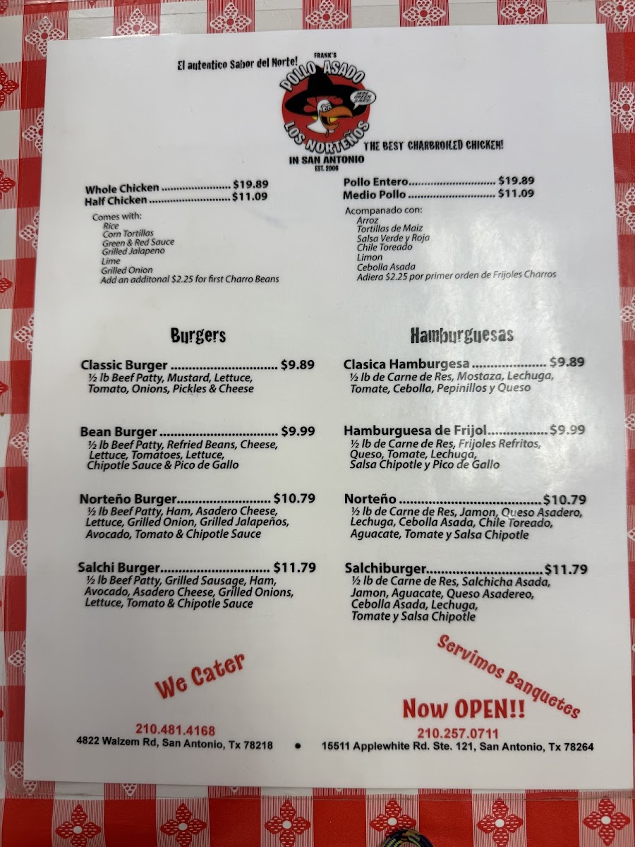 Welcome to Frank's Pollos Asados los Nortenos, a culinary gem located at 4822 Walzem Rd, San Antonio. This family-friendly eatery is renowned for serving the best pollos asados in town—a statement echoed by its delighted patrons. Enjoy fast and friendly service while you feast on their juicy chicken that's bursting with flavor.